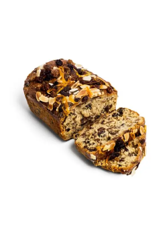 Water*, fortified plain wheat flour (with added calcium carbonate*, iron*, niacin*, thiamin*), unsalted butter (milk), light brown sugar, eggs, currants (10%), raisins (10%) (raisins, sunflower oil), sultanas (10%) (sultanas, sunflower oil), sour dried cherries (2%), Earl Grey tea (2%) (black tea (92%), natural bergamot flavouring*, orange peel, natural orange flavouring*, natural flavouring*), oranges (10%), candied orange and lemon peel (2%) (glucose corn syrup, orange and lemon peel), apricot jam (raw cane sugar, apricots, citrus pectin*, citric acid*), flaked almonds, sugar, baking powder (mono calcium phosphate*, corn starch, sodium bicarbonate*), vanilla extract. *Non-organic.